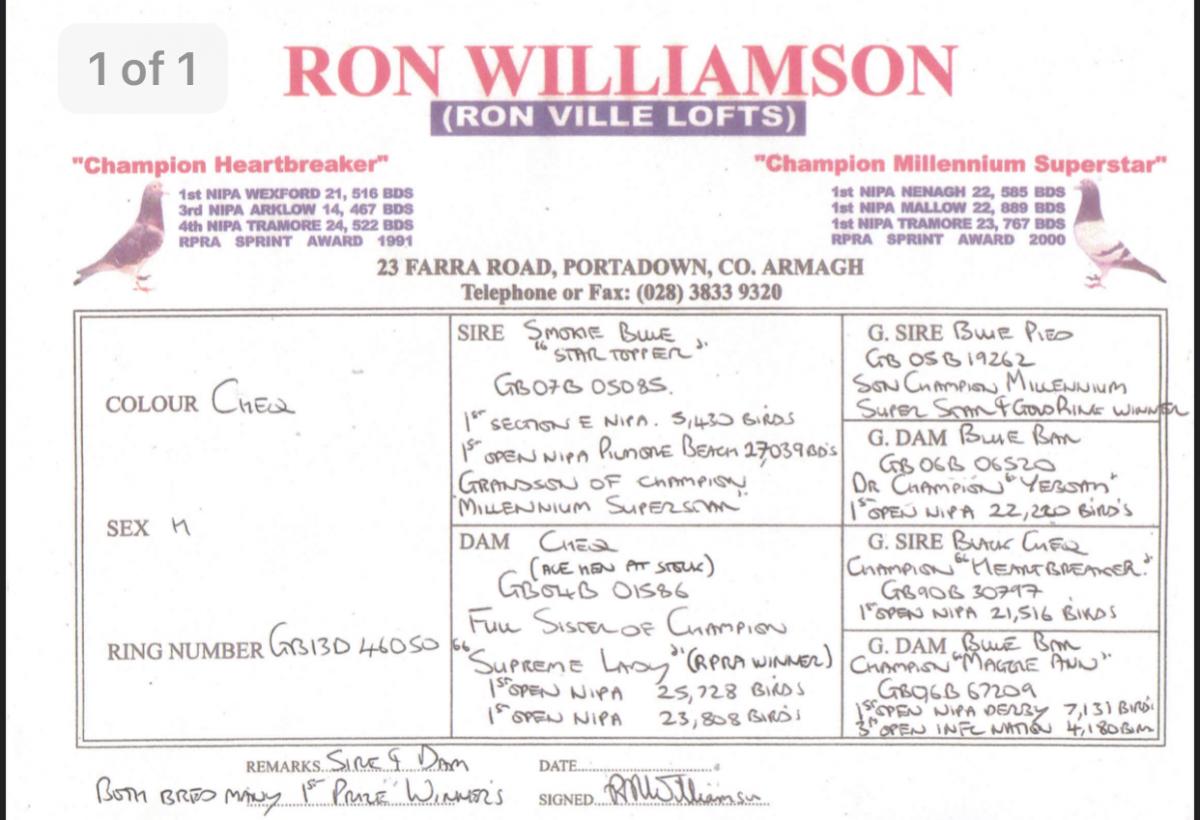 Dam is full sister to champion "Supreme Lady" 1st Open NIPA 25,728 birds and 1st Open NIPA 23,808 birds being daughter of champion "Heart Breaker" 1st Open NIPA 21,516 birds.